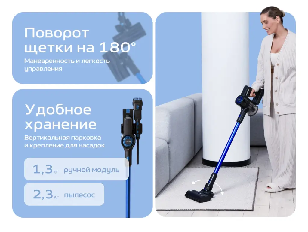 Мощный Li-Ion аккумулятор обеспечивает беспрерывную работу пылесоса до 35 минут. Этого времени хватит для полноценной уборки трехкомнатной квартиры.