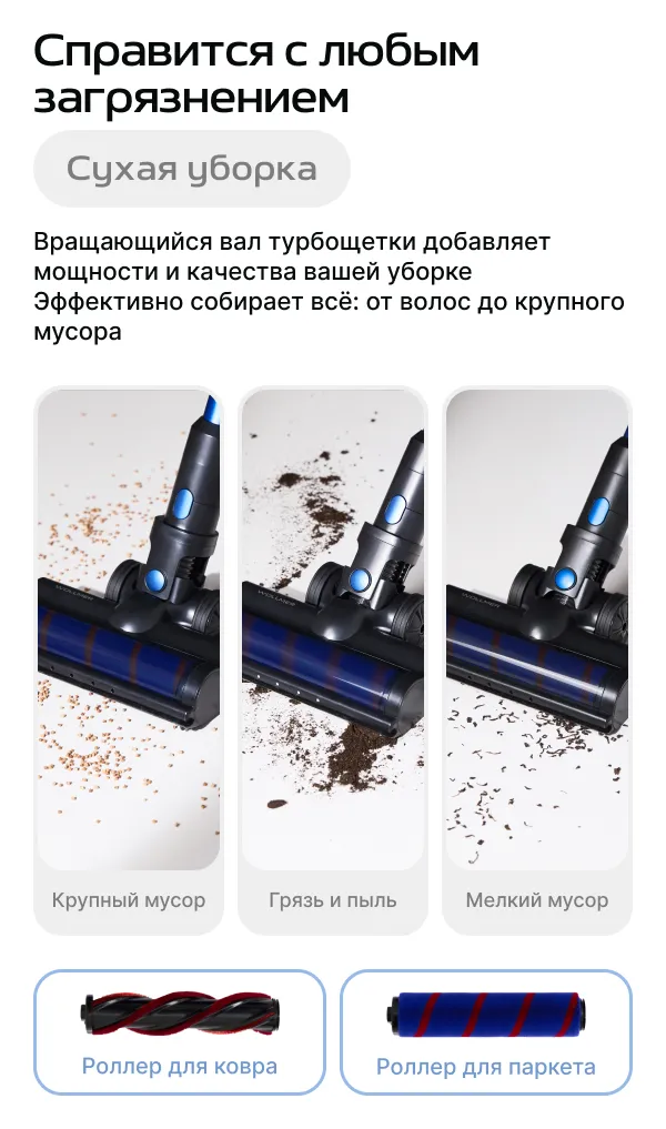 Турборежим справится с тяжелейшими загрязнениями. У мусора и пыли нет шансов. Двигатель, мощностью 315 Вт и турбощетка с двумя сменными роллерами соберут мельчайшие частицы.