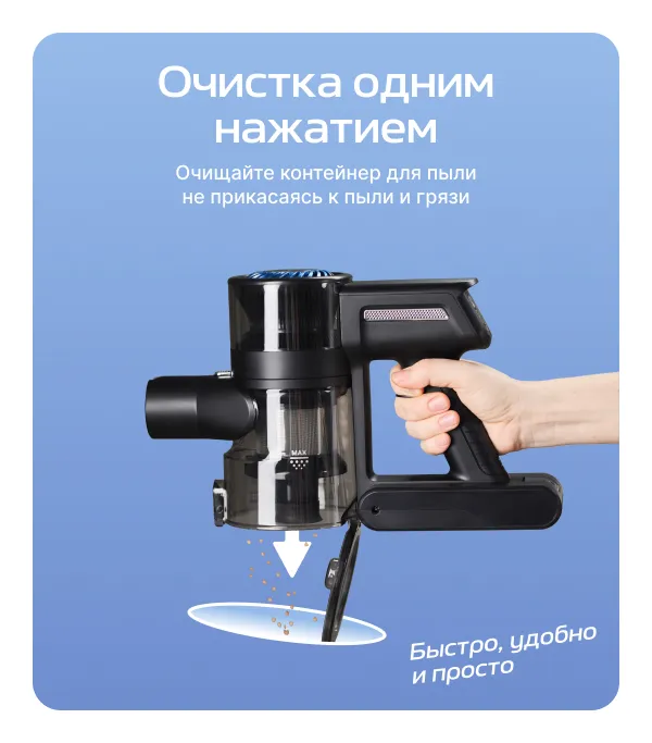 Очистка контейнера происходит одним нажатием. Вы не контактируете с собранным мусором.