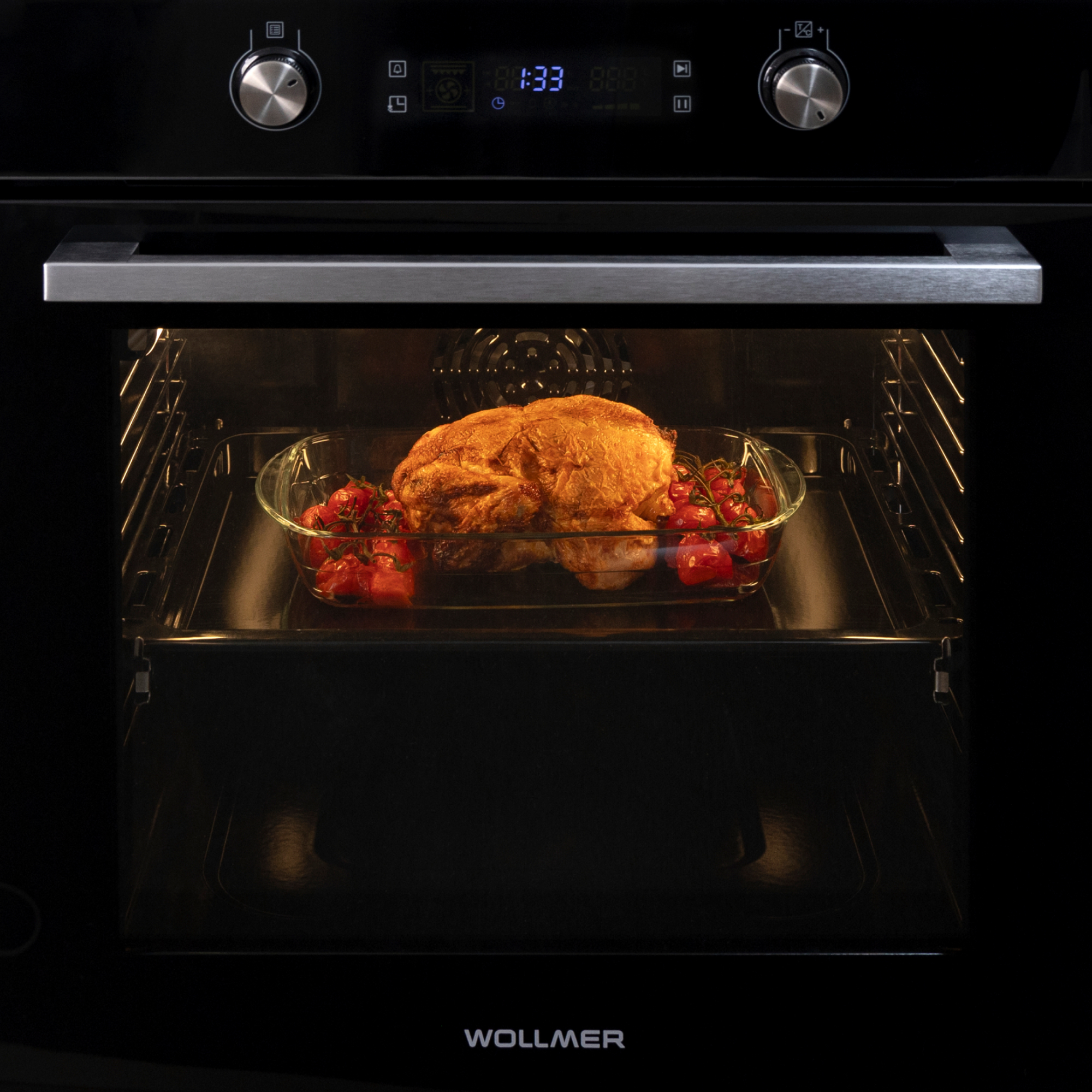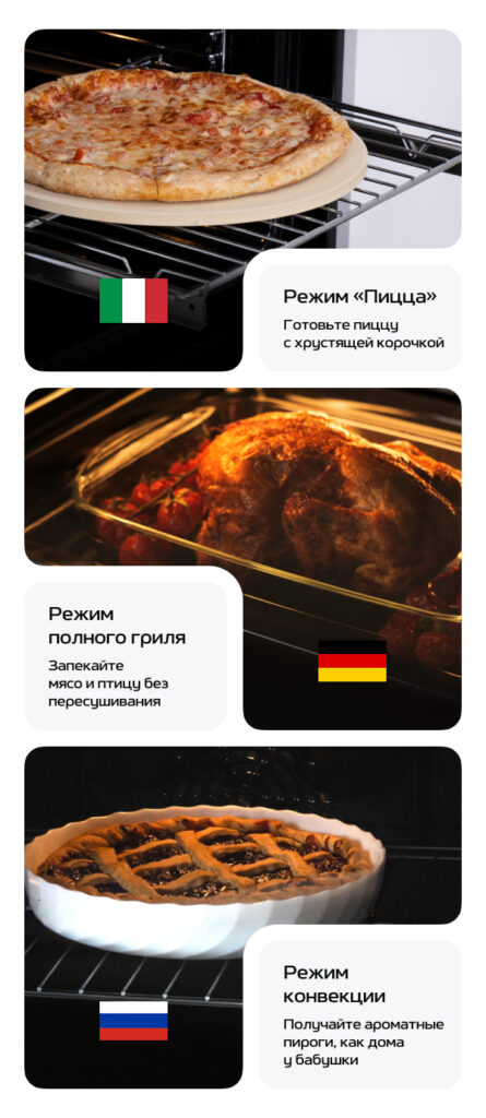 духовой шкаф, противень, глубокий противень, решетка, решетка для посуды, камень для пиццы, подъемная ручка, инструкция по эксплуатации, боковые стойки (2 шт), телескопические направляющие (2 шт)