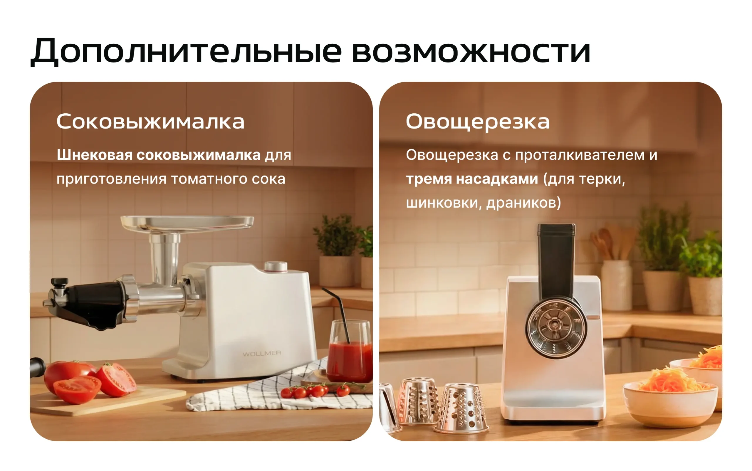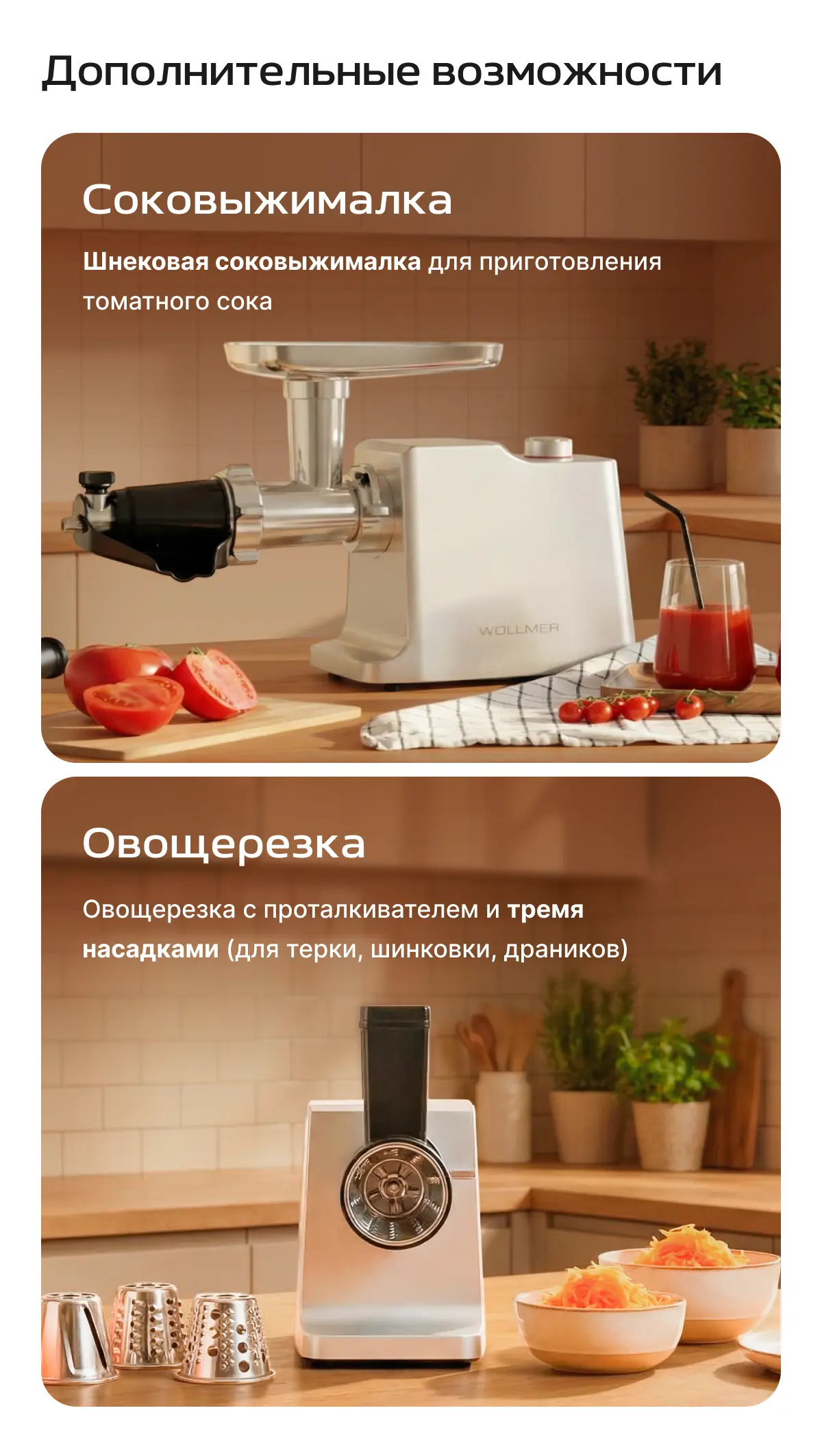 для кеббе/колбасы, овощерезки (для profi и profi plus), соковыжималка для томатов (для profi plus)