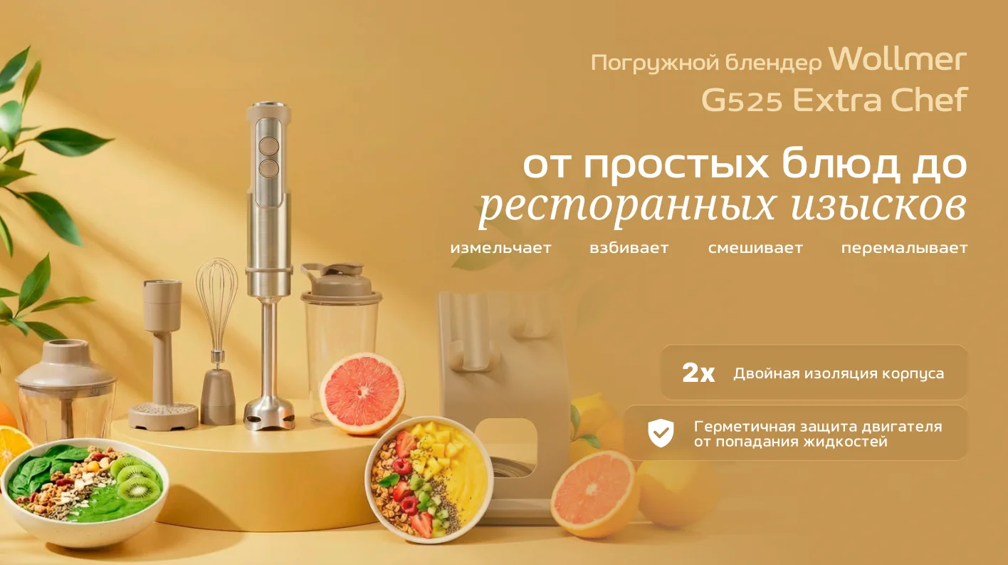 Двойная изоляция корпуса, герметичная защита двигателя от попадания жидкостей, food friendly