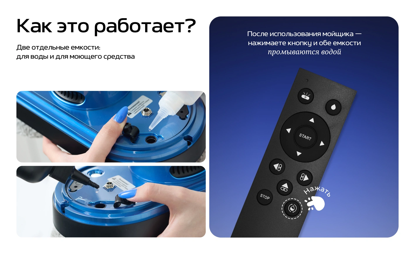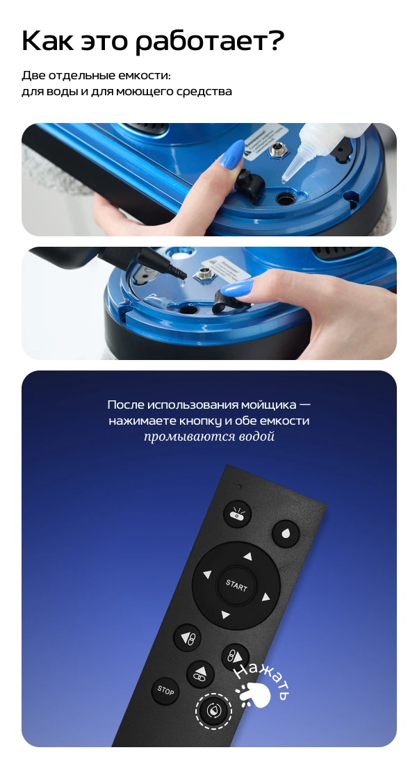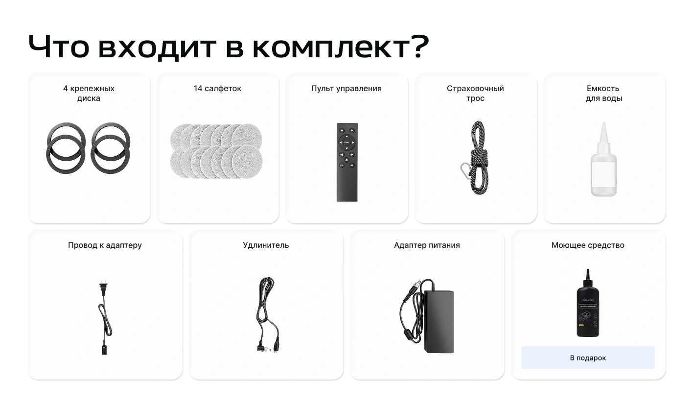 салфетки из микрофибры, крепежные диски, адаптер питания с удлинителем, флакон для переливания жидкости, пульт ДУ, страховочный трос